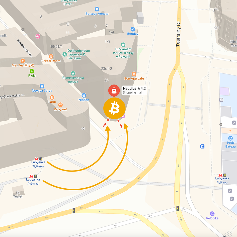Вы можете добраться до нашего криптомата на метро от знаменитой станции Лубянка; торговый центр находится всего в 1 минуте ходьбы от выхода 9 или 10, как вы можете видеть на карте рядом.